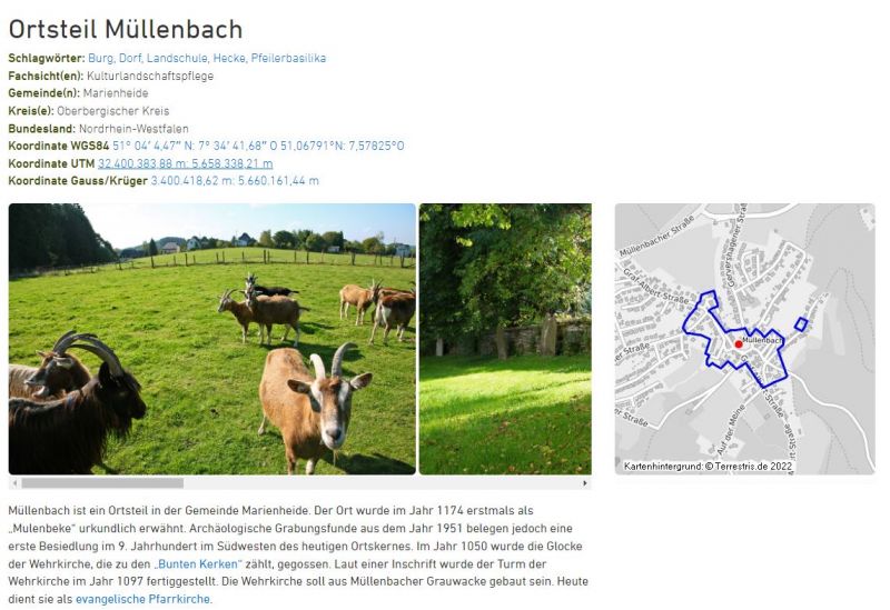 Frei nach dem Motto „Naturschutz beginnt vor der eigenen Haustür“ haben die Biologischen Stationen Oberberg und Rhein-Berg zwischen 2019 und 2021 vier Dorfgemeinschaften im LVR-Projekt „Bienen, Blüten, Begegnung – Biodiversität in bergischen Dörfern“ auf dem Weg zu mehr Artenvielfalt in den Dörfern begleitet. Im Rahmen des Projektes wurden mehrere Kulturlandschaftselemente in den Dörfern Marialinden (Overath), Olpe (Kürten), Hübender (Wiehl) und Müllenbach (Marienheide) erfasst und in KuLaDig eingetragen.
