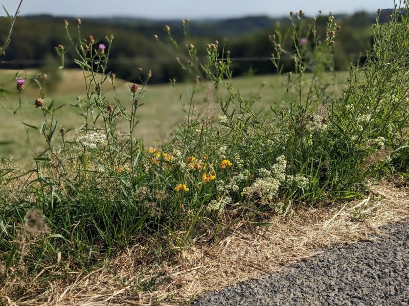 Artenreiche Säume an Weges- und Straßenrändern mit ihrem heimischen Blüten- und Nektarangebot haben in unserer Kulturlandschaft eine große Bedeutung als Rückzugsräume für Wiesenpflanzen und Nahrungsquelle für Insekten. Oft werden diese aber zu früh und zu oft gemäht und können daher diese Funktion nicht mehr erfüllen.Hier blühen Mitte Juli auf engstem Raum im schmalen Saum vier wertvolle Wiesenblumen: Wiesen-Flockenblume (Centaurea jacea), Kleine Bibernelle (Pimpinella saxifraga), Gewöhnlicher Hornklee (Lotus corniculatus) und Wiesen-Labkraut (Galium mollugo agg.) Rundherum ist bereits alles abgemäht.
